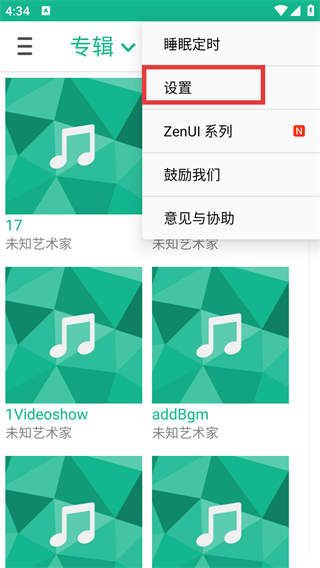 2、在展開的菜單列表中,選擇【設置】選項,進入音樂應用的設置配置頁面。