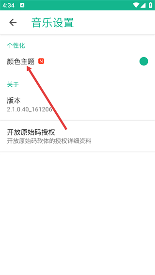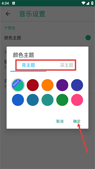 3、進入音樂設置頁面后,點擊【顏色主題】選項,觸發(fā)顏色主題的選擇彈窗。