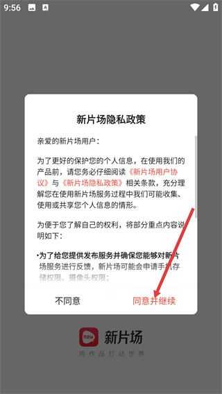 1、在新片場(chǎng)的隱私政策彈窗中,點(diǎn)擊【同意并繼續(xù)】按鈕,確認(rèn)《新片場(chǎng)用戶協(xié)議》《新片場(chǎng)隱私政策》后,進(jìn)入應(yīng)用首頁。