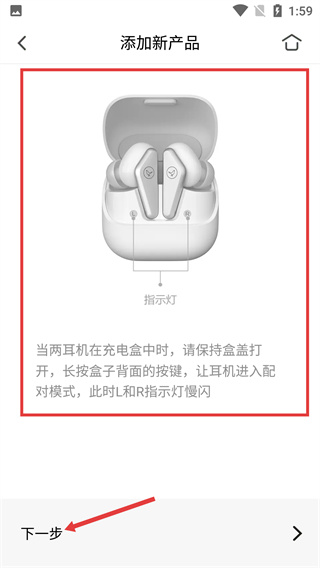 3、在產(chǎn)品配對指引頁面,按提示操作耳機進入配對模式后,點擊【下一步】按鈕,進入藍牙連接的操作說明頁面。