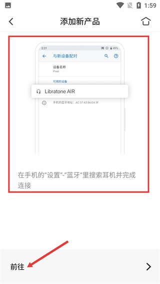4、在藍牙連接說明頁面,確認指引內(nèi)容后點擊【前往】按鈕,跳轉(zhuǎn)至手機藍牙設(shè)置界面完成【Libratone AIR】的連接。