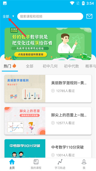 1、在學(xué)習(xí)軟件主頁(yè),點(diǎn)擊左上角的“全部”按鈕,打開教材版本與學(xué)段的選擇彈窗,準(zhǔn)備選定適配的學(xué)習(xí)內(nèi)容版本。