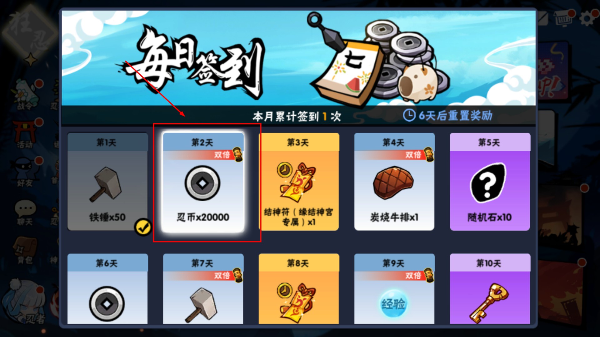 2、每日簽到第二天獎(jiǎng)勵(lì)為【忍幣×20000】且有雙倍標(biāo)識(shí),點(diǎn)擊領(lǐng)取可快速積累資源提升角色實(shí)力。