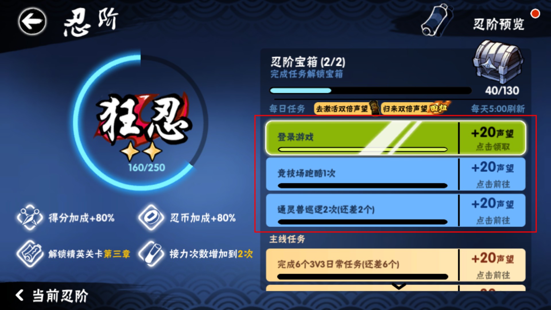3、忍階界面完成【登錄游戲】【競(jìng)技場(chǎng)跑酷1次】等任務(wù),領(lǐng)取聲望提升至【狂忍】解鎖寶箱獎(jiǎng)勵(lì)。
