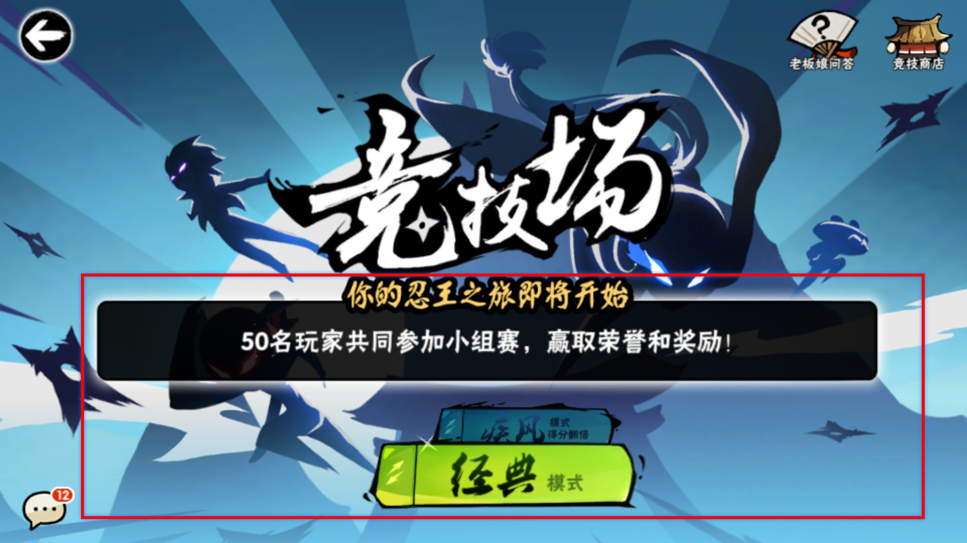 4、競(jìng)技場(chǎng)選擇【經(jīng)典模式】參與小組賽,與50名玩家競(jìng)技,贏取榮譽(yù)和獎(jiǎng)勵(lì)推進(jìn)忍王之旅。