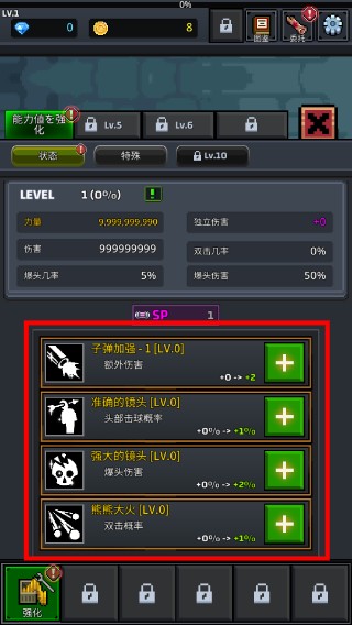 1、使用【SP】提升【子彈加速-1級(jí)】【準(zhǔn)確的射擊-1級(jí)】等技能,增強(qiáng)射擊效率與精準(zhǔn)度,助力對(duì)抗喪尸。