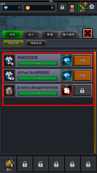 2、完成【感謝您的安裝】【從PixelStar獲取新聞】等活動(dòng)任務(wù),領(lǐng)取對(duì)應(yīng)獎(jiǎng)勵(lì),積累資源提升實(shí)力。