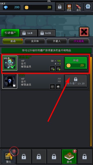 3、升級(jí)【變異僵尸-1級(jí)】,提升其產(chǎn)出的金幣與物品數(shù)量,快速積累資源強(qiáng)化自身。