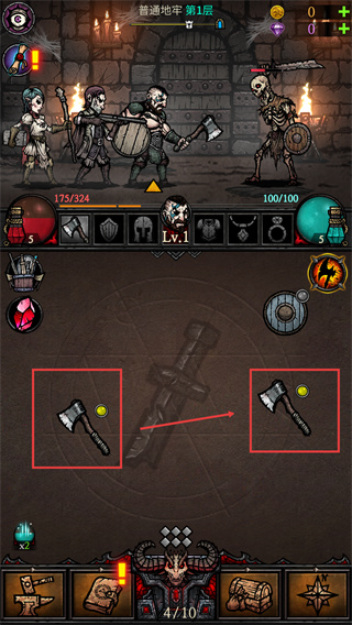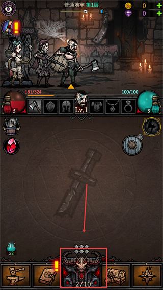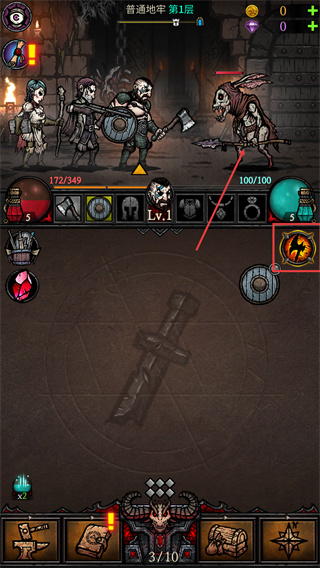 2、在【普通地牢-第1層】中,關(guān)注底部進(jìn)度(當(dāng)前2/10),通過(guò)操作積累進(jìn)度以推進(jìn)地牢探索流程。