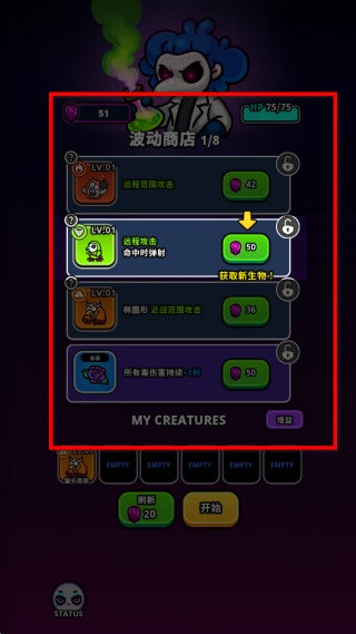 2、進(jìn)入波動(dòng)商店界面,消耗對(duì)應(yīng)的紫色道具,選擇想要的生物或技能進(jìn)行獲取,獲取后可增強(qiáng)自身的作戰(zhàn)能力。