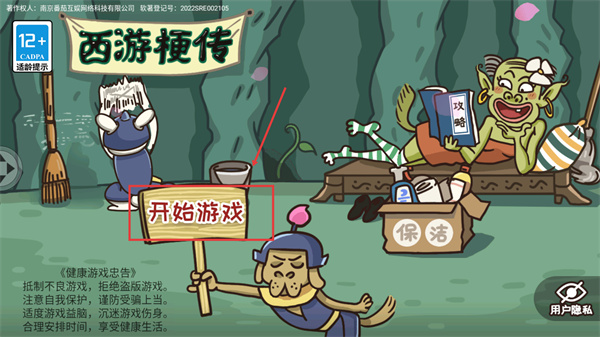 1、進(jìn)入【西游梗傳】后,點(diǎn)擊【開(kāi)始游戲】按鈕進(jìn)入關(guān)卡,界面中的趣味元素可輔助理解劇情設(shè)定。