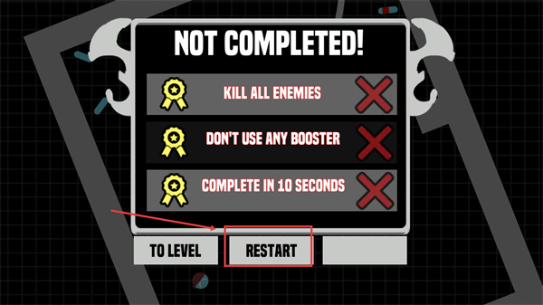 4、未完成關(guān)卡時(shí),點(diǎn)擊【RESTART】重新挑戰(zhàn),需達(dá)成【KILL-ALL-ENEMIES】等目標(biāo)以通關(guān)。